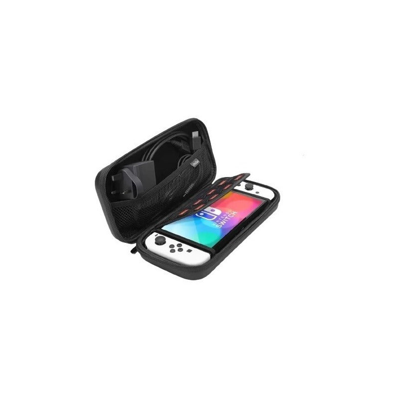 DESCRIPCIÓN Cubierta protectora diseñado especialmente para el almacenamiento de tú Nintendo Switch OLED mas lamina de vidrio templado para proteger la pantalla Posee un gran tamaño con diversos bolsillos en su interior, y proporcionar espacio más pequeños para almacenar los accesorios como cable de carga, tarjetas SD, etc. Esta funda rígida para Nintendo Switch OLED está compuesta por el material EVA, lo que hace que la calidad de la funda sea alta, además de resistente. Esta reforzando así que no sufra ningún daño. Además de lo anterior, ofrece espacio para 10 cartuchos de juego. Ideal para llevar su consola a donde quieras. Ojo solo es para nintendo switch OLED