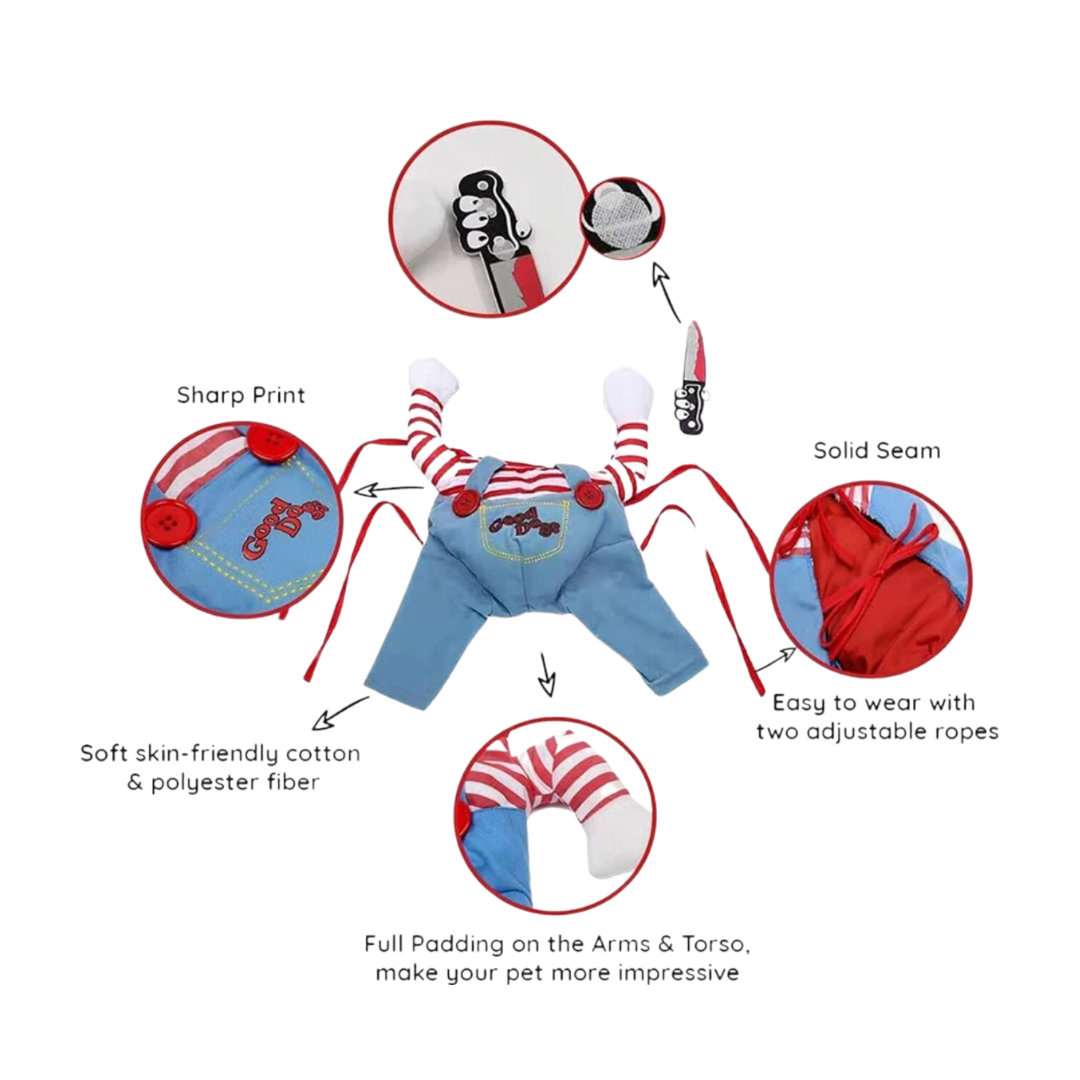 Diseño: el diseño de este icónico disfraz de muñeco de terror, ahora se ve como un disfraz, pero para las mascotas, este icónico personaje tiene las mismas características, que siempre ha tenido. La peluca y el cuchillo que utilizada es muy adecuada para Halloween, ideal para fiestas de disfraces o evento tematico asi como para fotografías entre otros, atraerá mucha atención porque hará que las mascotas se vean lindas.
