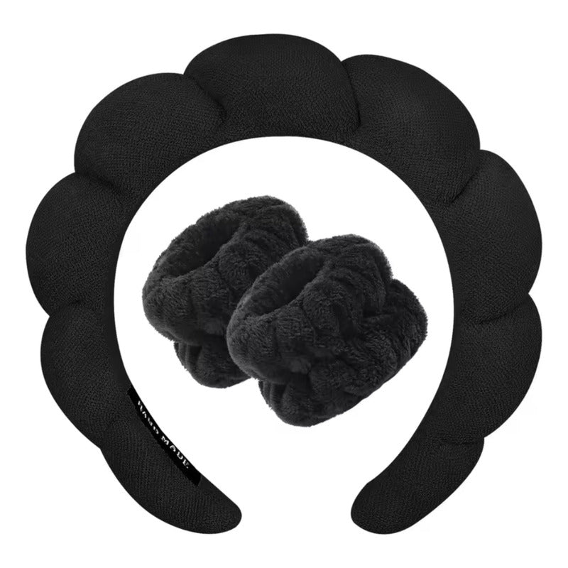 El cintillo, elaborado en tela suave, asegura una sujeción cómoda y firme, manteniendo tu cabello alejado de tu rostro durante tus rutinas de belleza. Las muñequeras complementan perfectamente el conjunto, proporcionando una experiencia práctica y sofisticada, ideal para el día a día o momentos de autocuidado.