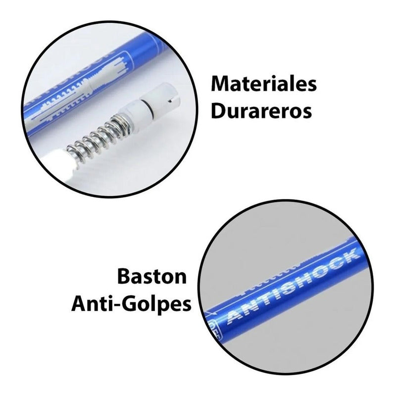 Descripción BASTÓN TREKKING, 3 TRAMOS MANGO RECTO ANTISHOCK Características : Bastones de trekking trifasicos (tres tramos), productos nuevos, son ultralivianos, dos modelos mango liso, antishock desbloqueable, Nucleo metalico no de plastico como la mayoria de los bastones. Incluye: -Roldana para nieve o arena -Punta de acero para terrenos volcanicos o rocosos -stopperol para terrenos normales Características Técnicas : . Medidas minima 60 cms, medida maxima 1,35 mts . Peso 250 grs . Colores : Negro, Rojo, Plateado, Azul . Material : Aluminio . Sistema Antishock . Modo de uso: absorbe golpes